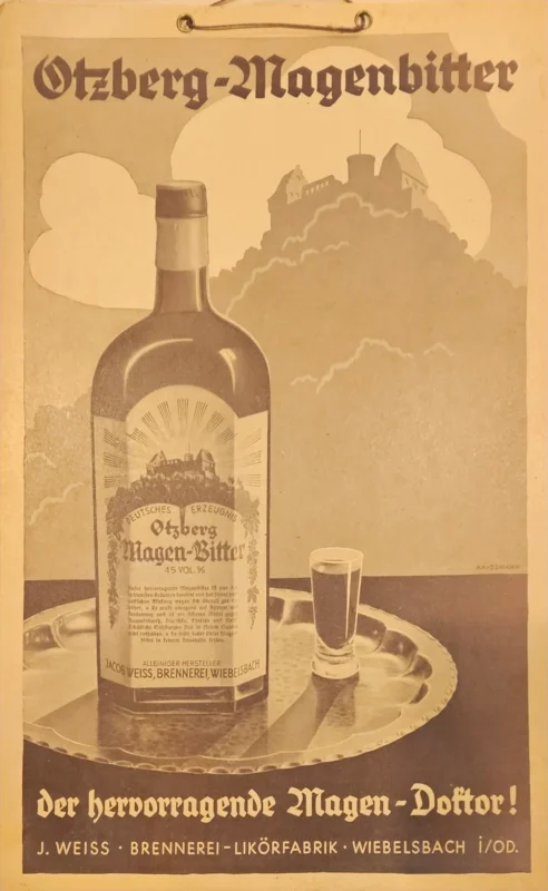 So ist auch unser Otzberg Anfangs ein „Sonder-Erzeugnis der Brennerei und Likörfabrik J. Weiss“. Zunächst kommt der Otzberg als klassischer „Magenbitter“ auf den Markt. Nach etwas zu viel leckerem Essen soll der „hervorragende Magen-Doktor“ vor allem eins: aufräumen. Das tut er zwar immer noch. Gesundheitsversprechen und Alkohol gehen heute glücklicherweise aber nicht mehr zusammen.